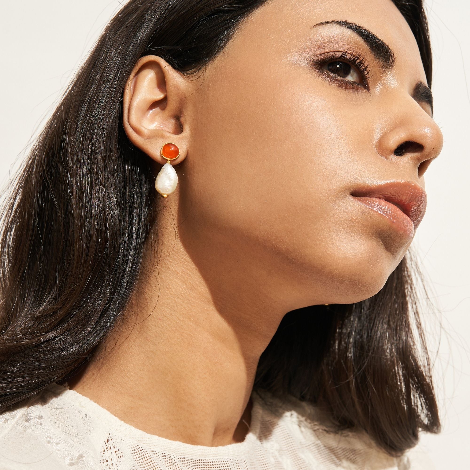 Set in gold-plated brass, the red onyx brings a warm, grounded tone that reads strong without feeling heavy. Paired with a single freshwater pearl drop, the contrast feels intentional rather than decorative. The scale is easy, sitting close to the ear with just enough movement to catch light as you go.