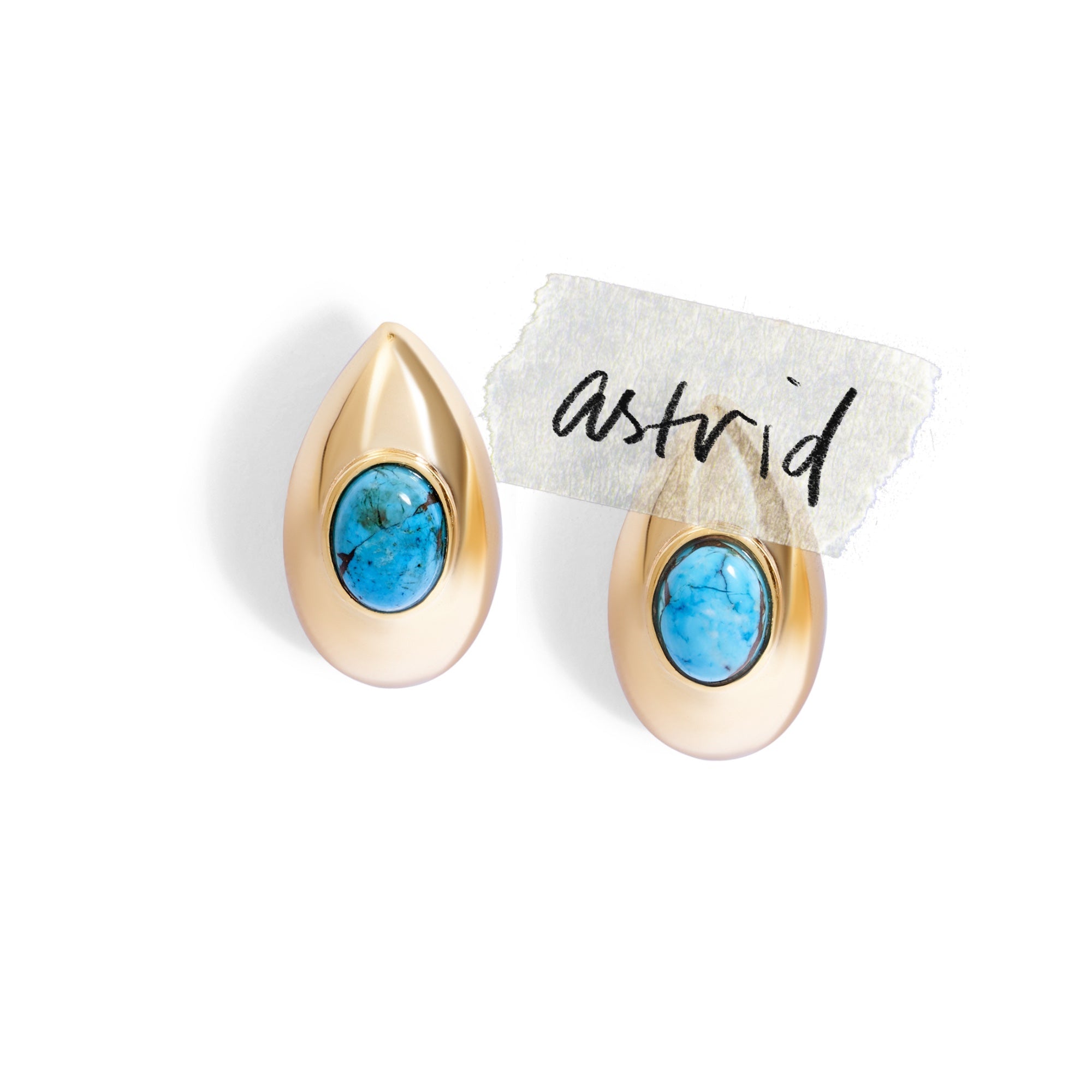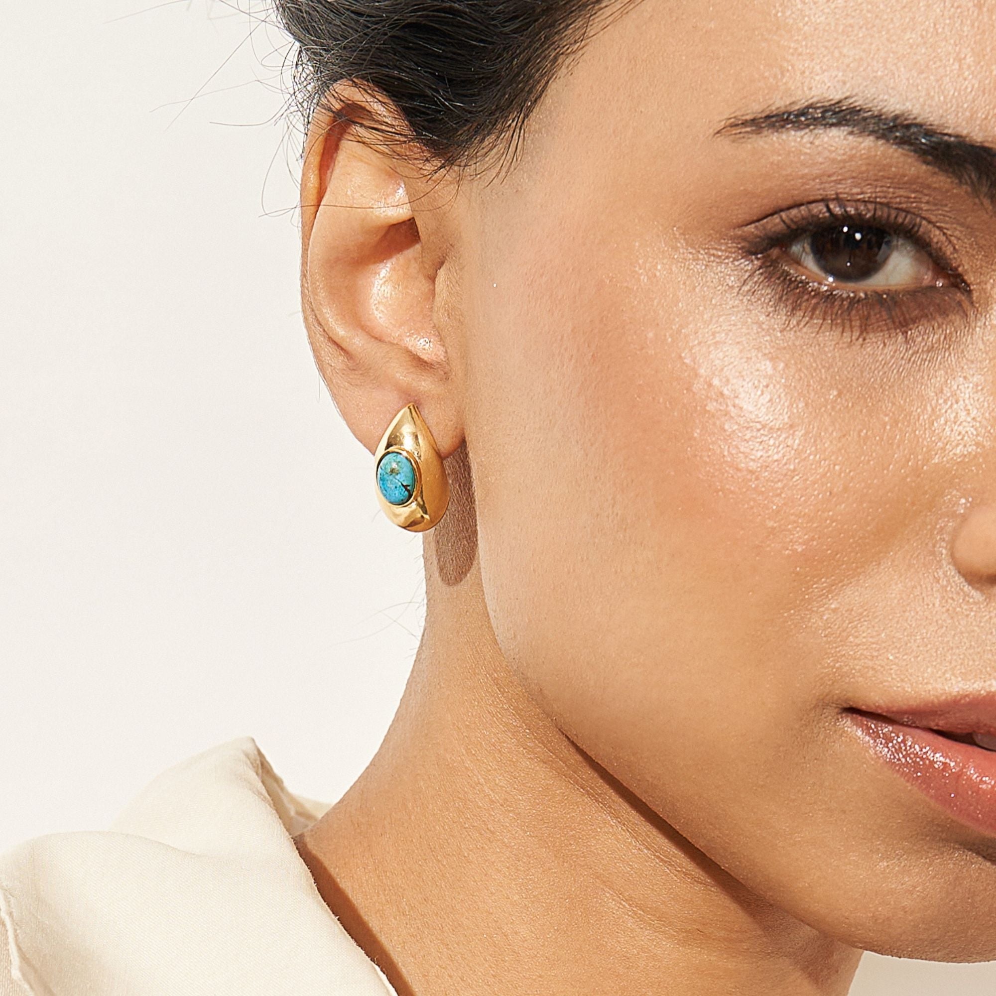 Made in gold-plated brass, these earrings sit close and easy, with copper turquoise adding a gentle pop of colour. They’re light, uncomplicated, and designed to move with you through the day. Wear them in the morning with linen and sun-warmed skin, then again at night with sharper silhouettes - they don’t ask for an outfit change to make sense.