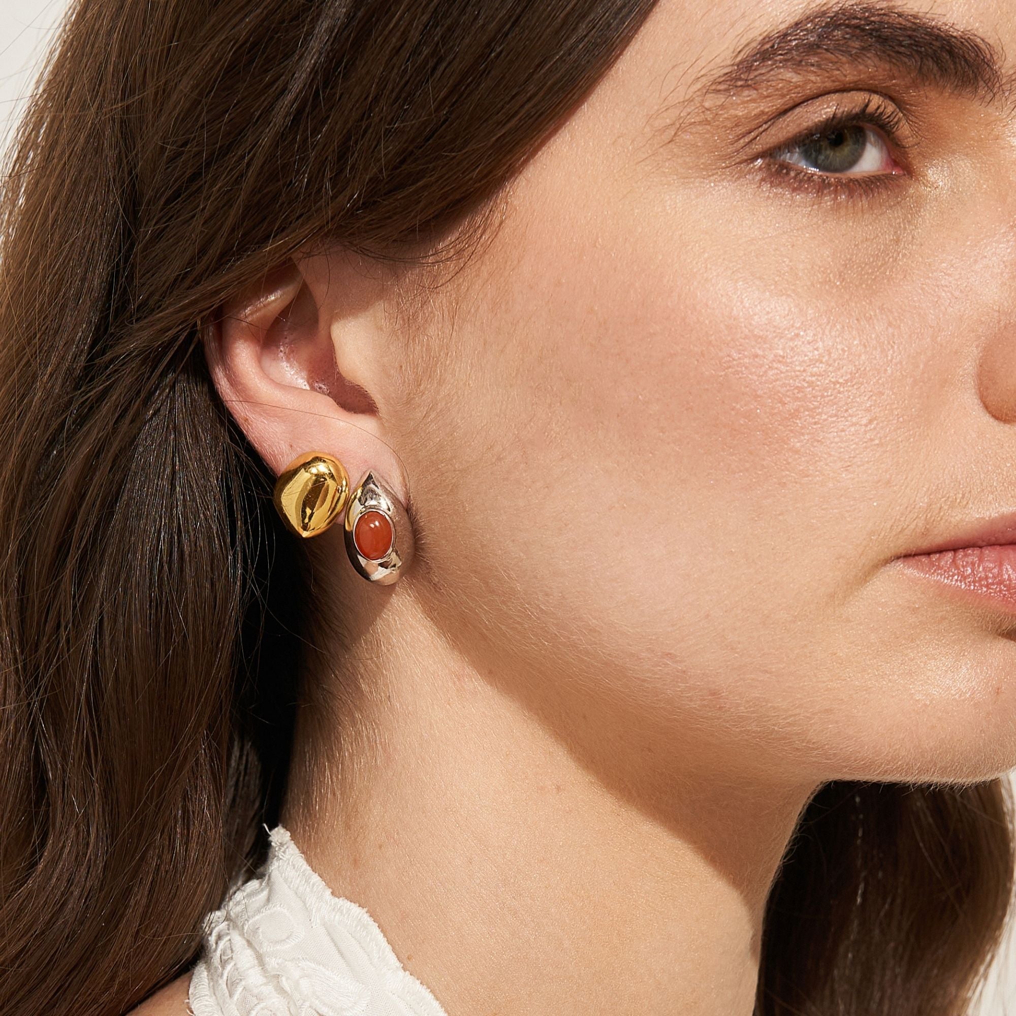 Made in rhodium-plated brass, these earrings sit close and easy, with a deep red onyx stone that brings warmth and depth without feeling loud. The colour reads rich and grounded, catching the light just enough as you move. Light in weight and uncomplicated in form, they move comfortably from daytime plans into late evenings.