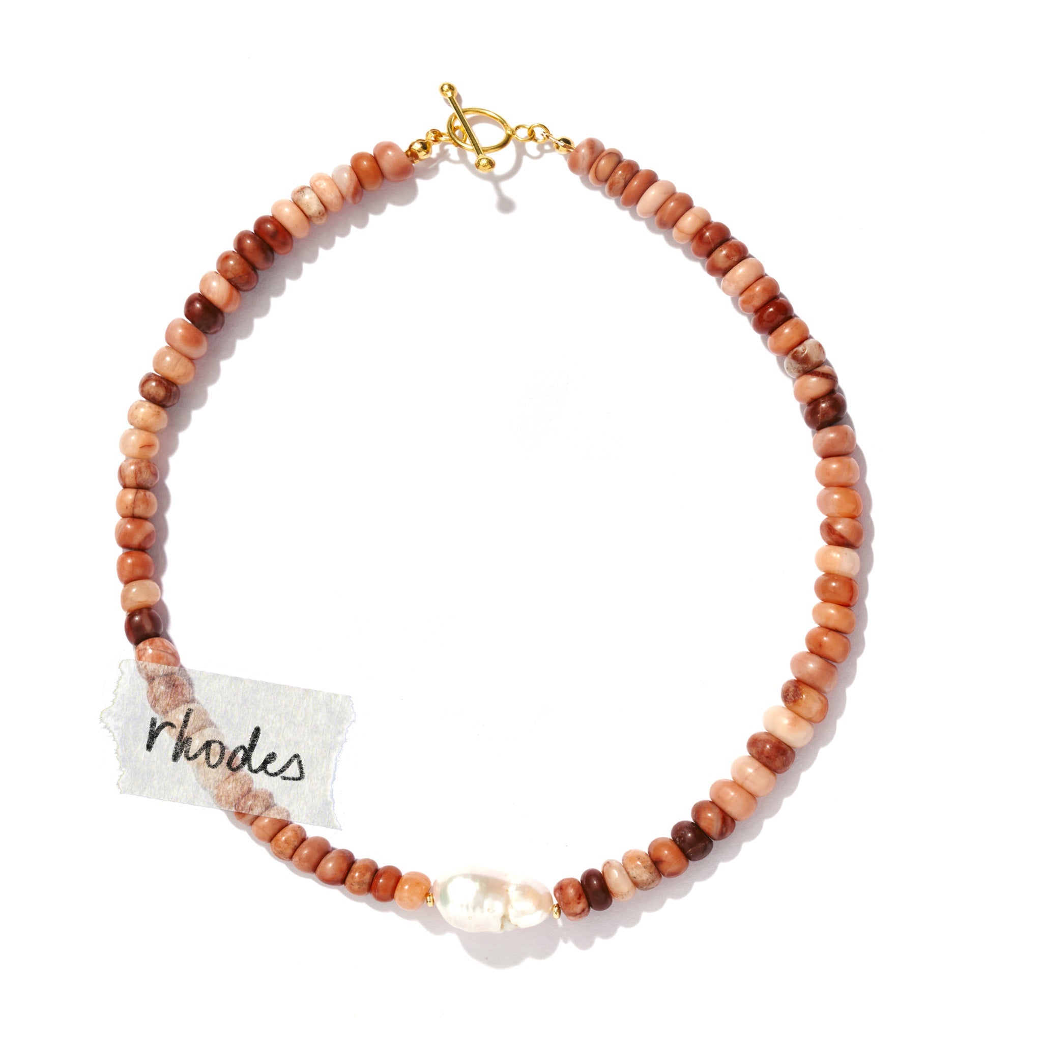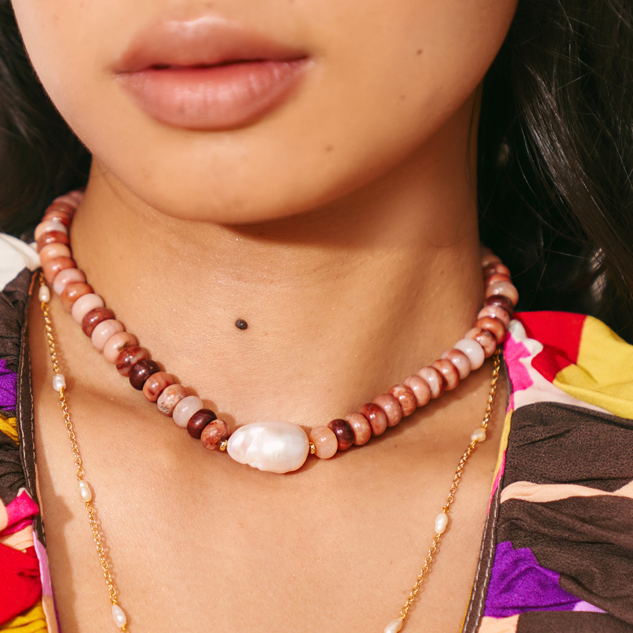 In warm terracotta and russet tones, the Rhodes in red agate brings a sun-baked palette to your stack. A bold strand of red agate rondelle beads centres on a single baroque freshwater pearl. The necklace closes with a brass toggle clasp plated in 18k gold.