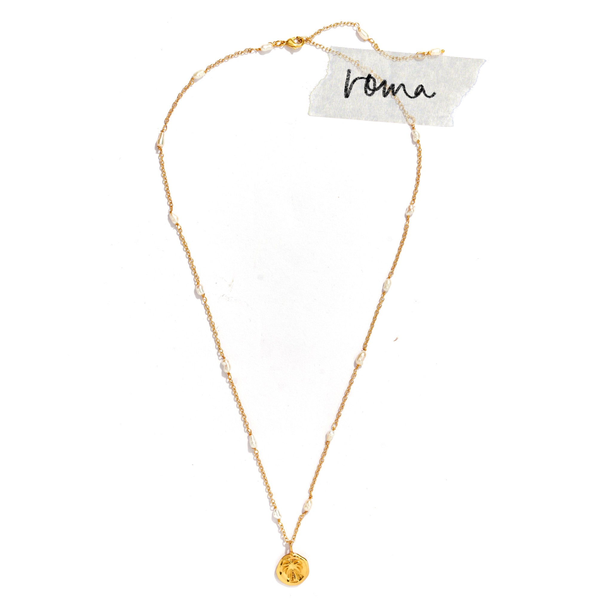 The Roma Necklace has a delicate brass chain with 14k gold-tone plating, punctuated with tiny freshwater pearls and finished with a carved coin pendant featuring our Love Letter icons. The longer chain is the perfect accent to a beaded piece or worn by itself to add a little vacay energy to an everyday blouse, an evening slip dress or your favourite linen shirt.