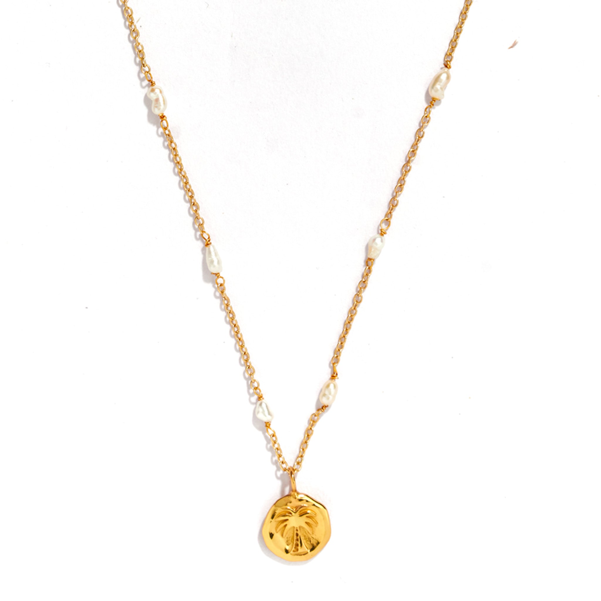 This pendant features the palm tree, that represents the grounding element earth. It's steady, rooted, and unshakeably present. Cast in brass and plated in 14k gold-tone plating, the palm pendant is the reminder that even when you’re far away, you carry a piece of your home within you.