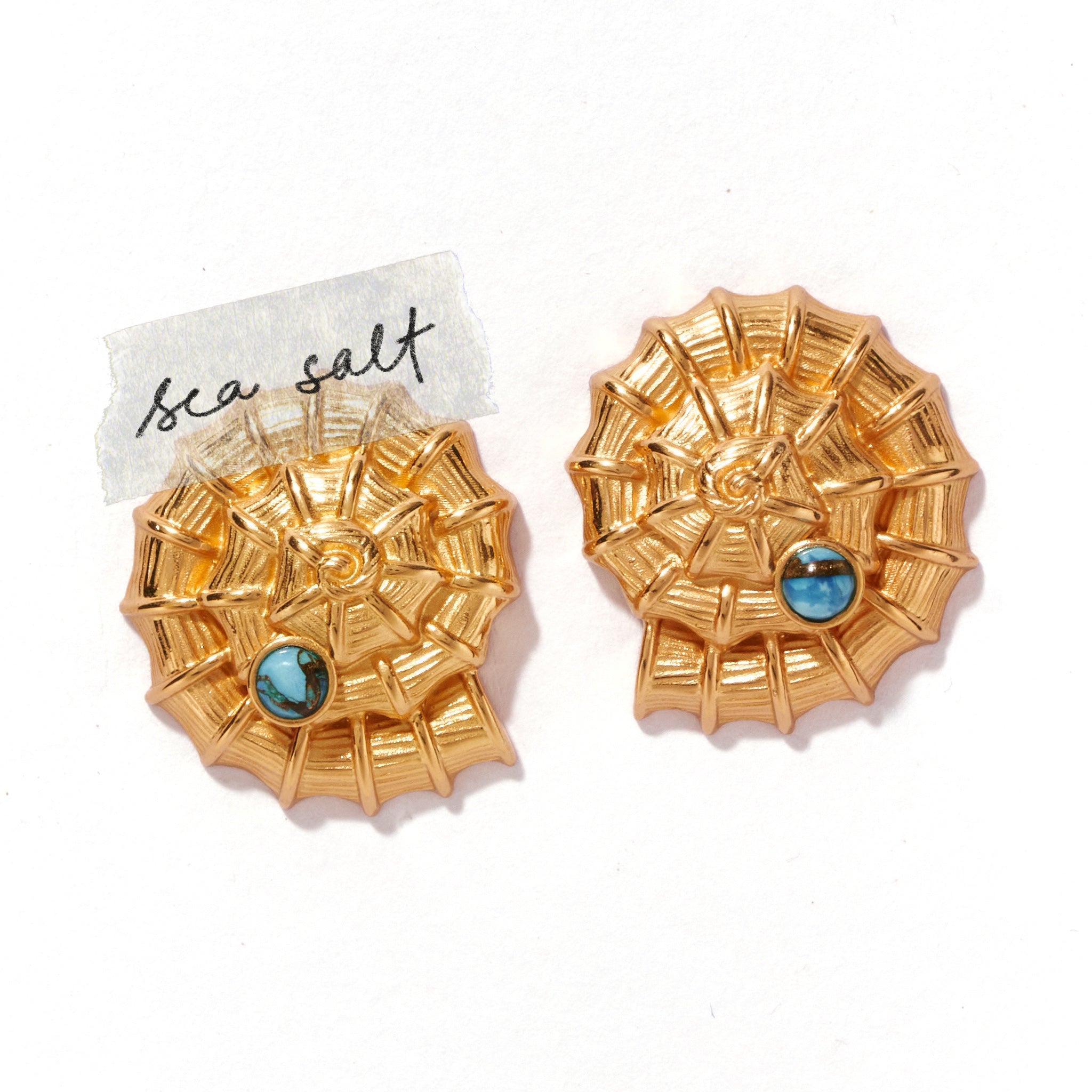 Washed ashore to turn into a sweet reminder of the sea, these earrings are cast in brass with 14k gold-tone plating. A polished copper turquoise sits within the ridged seashell form, a vivid accent of blue against the golden shell.